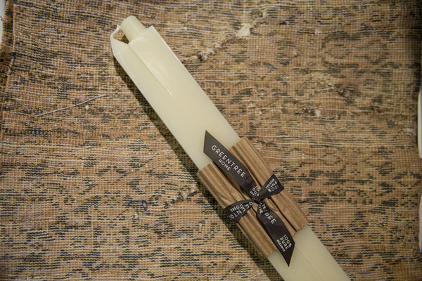 Simple and stylish, these 16" inch taper candles made by Greentree Home are just divine. Sold as a pair. Each candle is hand poured and individually finished in Catskills, NY. Lovingly made from 100% pure beeswax. Note: All tapers have a 7/8" base form or a 3/4" bottom. This is a standard taper candle cup size. Kindly note, this item has been on the shop floor and may show signs of use and/or age.