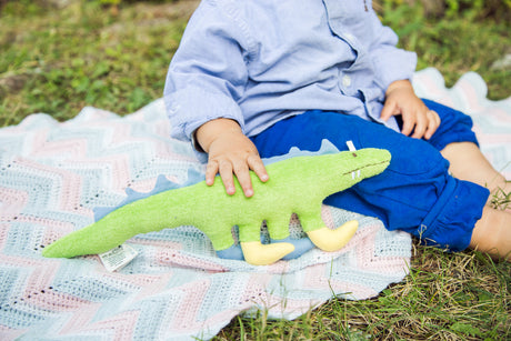 :: Crazy cute! All natural 100% organic Egyptian cotton stuffed animal toy for baby or toddler -- little dinosaur with little booties on. Adorable and well made, this toy will last a lifetime! Best yet, machine wash cold for easy cleaning. Made in Egypt by Under the Nile. Measures 14" long, Fair trade certified, made with absolutely NO Azo colorants, BPA, flame retardants, formaldehyde, fragrance, PVC or lead.