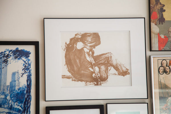 :: This is our very last one! -- Vintage, large, awesome, and rare 14" x 17" 1970's lithograph by artist Frank Palmieri, that seems to be untitled but we have labeled "girl on guitar". Very expressive yet minimalistic piece of art depicting a young woman playing the guitar. Only color used was brown. No publishing information is printed on the lithograph. In very good condition with minimal signs of handling (very slight edge tears and bends). The type of paper the print was made on is very starchy, very heavy-gauge. *Frame to show the lithograph in context but is not included, listing is for litho only*