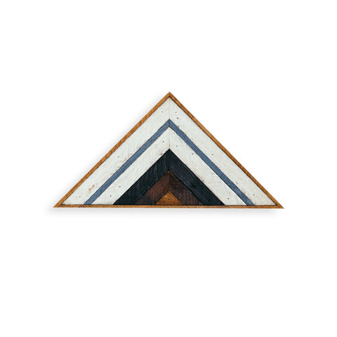 :: Meet Shelby, a smaller, triangular piece in your choice of cornflower blue colorway. Charred wood and whitewashed wood make the piece's colorful stripes pop. This piece features reclaimed wood with its original stain, hand-charred wood and whitewashed pieces, as well as small pops of rose quartz in the center. This piece of rustic wall art is created by 1767 Designs from wood rescued from various homes prior to their demolition in Nashville, TN. Each piece tells the story of the materials used to create it, including the address where the home once stood and the year it was built. *Please note that since only found materials are used, wood color/tones will vary from piece to piece and will not be exactly as pictured. Also, finished dimensions may vary within . 25"-. 5" since we are working with inconsistent rough sawn lumber. Kindly reference photos for condition or contact us directly! Size measures 14" x 14" x 20".