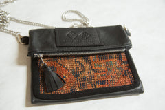 :: Beautiful and compact rug purse made by luxury handbag UK brand Swag and Tassel. As their first USA distributor, we are so excited to share the amazing craftsmanship, quality, and aesthetic of their handmade carpet bags. Features vegetable tanned leather, cotton detailing, metal zipper, metal chain, and one of a kindantiqueKurdish rug fragment.