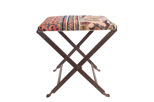 :: Exclusive Old New House® rug ottoman / foot rest made from reclaimed industrial fold out base and upholstered antique rug fragment insert (antique circa 1900 Persian Khorassan Doroksh. The best part is that it ships flat so shipping costs are lower than normal for furniture pieces and if you want to put it away for special occasions, it stores so easily! Just pop the rug seat out and fold up the base! Each one is limited edition piece, handmade in house in Katonah, New York. With 2 of them teamed up at the foot of the bed or one used as a resting spot for your feet in front of favorite chair, the options are endless. Measures 12" x 16" and 17.5" tall.