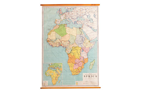 :: Amazing and unique vintage 1960s pull down map of Africa. Map is in very good condition with subtle signs of age and use. Size measures 46" w w/o dowel, 48" w w/dowel, 66" tall w/o dowel, 68" tall w/dowel.