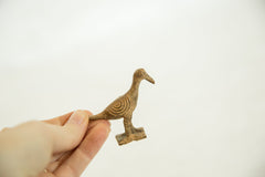 :: Vintage handmade African Bronze Bird. Circa mid 20th century and possibly older, this piece has such incredible handmade charm and no two are identical. Create a scene of wildlife with many of our vintage African animal sculptures or add just one to the shelf, these are beautiful collectibles that you or someone you love will cherish forever. As this item is in vintage condition, it may show signs of age and use. You may receive one that is slightly different than the one photographed since we have multiples of this item. Please contact us prior to purchase if you would like us to send additional snapshots of the one we would be sending. Size measures: 1" x 3" x 2.5"