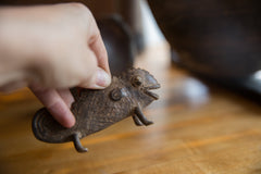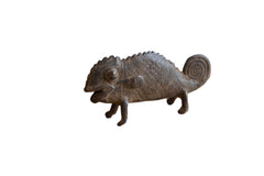 :: Vintage handmade African bronze chameleon. Circa mid 20th century and possibly older, this piece has such incredible handmade charm and no two are identical. Create a scene of wildlife with many of our vintage African animal sculptures or add just one to the shelf, these are beautiful collectibles that you or someone you love will cherish forever. As this item is in vintage condition, it may show signs of age and use. You may receive one that is slightly different than the one photographed since we have multiples of this item. Please contact us prior to purchase if you would like us to send additional snapshots of the one we would be sending. Size measures: 1" x 4.5" x 2.25"