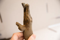 :: Vintage handmade African crocodile with fish sculpture. Circa late mid 20th century, each figure in this collection represents a different variation of protection and spirit used inside and outside of the local homes. These are beautiful collectibles that you or someone you love will cherish forever. As this item is in vintage condition, it may show signs of age and use. Size measures: 3" x 10.5" x 2".