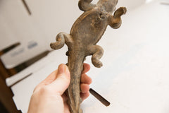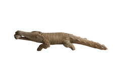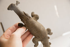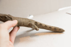 :: Vintage handmade African crocodile with fish sculpture. Circa late mid 20th century, each figure in this collection represents a different variation of protection and spirit used inside and outside of the local homes. These are beautiful collectibles that you or someone you love will cherish forever. As this item is in vintage condition, it may show signs of age and use. Size measures: 3.5" x 9" x 2".