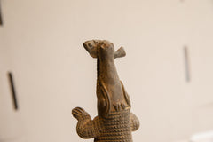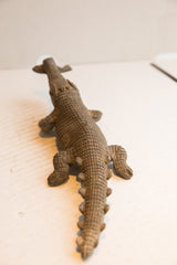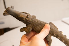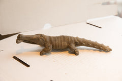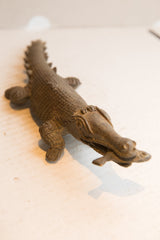 :: Vintage handmade African crocodile with fish sculpture. Circa late mid 20th century, each figure in this collection represents a different variation of protection and spirit used inside and outside of the local homes. These are beautiful collectibles that you or someone you love will cherish forever. As this item is in vintage condition, it may show signs of age and use. Size measures: 3.25" x 9.75" x 2".