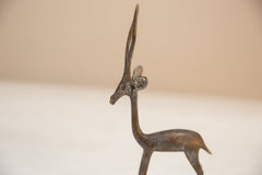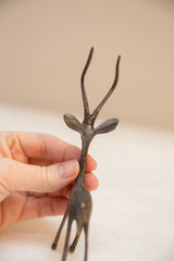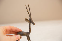 :: Vintage handmade African dark bronze gazelle. Circa mid 20th century and possibly older, this piece has such incredible handmade charm and no two are identical. Create a scene of wildlife with many of our vintage African animal sculptures or add just one to the shelf, this is a beautiful collectible that you or someone you love will cherish forever. As this item is in vintage condition, it may show signs of age and use. Size measures: 1.5" x 3" x 6"