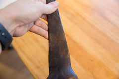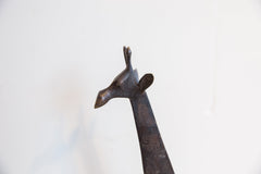 :: Vintage handmade African giraffe with dark patina. Made approximately 40-70 years ago, each figure in this collection represents a different variation of protection and spirit used inside and outside of the local homes. These are beautiful collectibles that you or someone you love will cherish forever. As this item is in vintage condition, it may show signs of age and use. Size measures: 1.5" x 4" x 18.25".