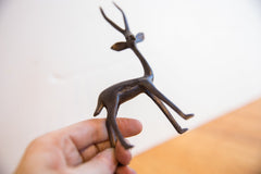 :: Vintage handmade African right facing gazelle with dark patina. Circa 1960s though possibly older, this piece has such incredible handmade charm and no two are identical. Create a scene of wildlife with many of our vintage African animal sculptures or add just one to the shelf, these are beautiful collectibles that you or someone you love will cherish forever. As this item is in vintage condition, it may show signs of age and use. Size measures: 1" x 3" x 6".