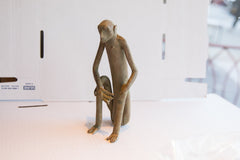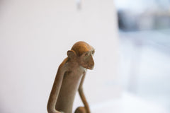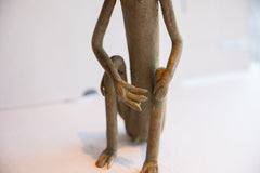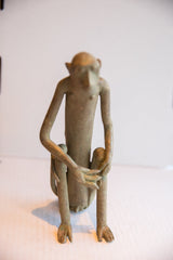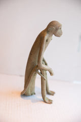 :: Vintage handmade African sitting monkey with banana sculpture. Circa late mid 20th century, each figure in this collection represents a different variation of protection and spirit used inside and outside of the local homes. These are beautiful collectibles that you or someone you love will cherish forever. As this item is in vintage condition, it may show signs of age and use. Size measures: 3.75" x 3.75" x 8.5".