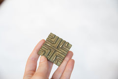:: Vintage handmade square bronze coin. Circa mid 20th century and possibly older, this piece has such incredible handmade charm and no two are identical. Possibly used to stamp patterns into clay. As this item is in vintage condition, it may show signs of age and use. You may receive one that is slightly different than the one photographed since we have multiples of this item. Please contact us prior to purchase if you would like us to send additional snapshots of the one we would be sending. Size measures: 2" x 2" x 0.5"