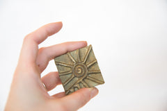 :: Vintage handmade square bronze coin. Circa mid 20th century and possibly older, this piece has such incredible handmade charm and no two are identical. Possibly used to stamp patterns into clay. As this item is in vintage condition, it may show signs of age and use. You may receive one that is slightly different than the one photographed since we have multiples of this item. Please contact us prior to purchase if you would like us to send additional snapshots of the one we would be sending. Size measures: 2" x 2" x 0.5"