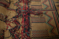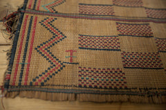 :: Vintage handmade African tuareg rug mat. Circa 1950s, this handwoven rug mat is full of character and charm. Believed to be made by the Tuareg people in/around Niger. When making, the weavers would often merge multiple pieces of straw together by inserting one into another to create a piece long enough to weave. Sold in as found vintage handmade condition. In some cases flushing clean water through the mat may be needed in order to clean it, though please note that doing so makes all sales final. Sizes vary in some cases from end to end and side to side. Measurements exclude warps/tassels. Size measures: 1'2" x 1'10".