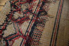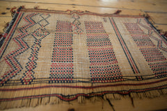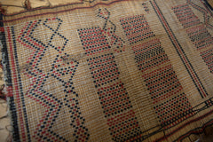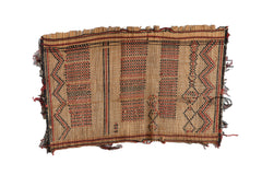 :: Vintage handmade African tuareg rug mat. Circa 1950s, this handwoven rug mat is full of character and charm. Believed to be made by the Tuareg people in/around Niger. When making, the weavers would often merge multiple pieces of straw together by inserting one into another to create a piece long enough to weave. Sold in as found vintage handmade condition with some stains and tatter. In some cases flushing clean water through the mat may be needed in order to clean it, though please note that doing so makes all sales final. Sizes vary in some cases from end to end and side to side. Measurements exclude warps/tassels. Size measures: 1'5" x 2'3".
