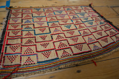 :: Vintage handmade African tuareg rug mat. Circa 1970s, this handwoven rug mat is full of character and charm. Believed to be made by the Tuareg people in/around Niger. When making, the weavers would often merge multiple pieces of straw together by inserting one into another to create a piece long enough to weave. Sold in as found vintage handmade condition. In some cases flushing clean water through the mat may be needed in order to clean it, though please note that doing so makes all sales final. Sizes vary in some cases from end to end and side to side. Measurements exclude warps/tassels. Size measures: 1'5" x 2'1".
