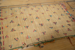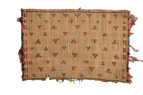 :: Vintage handmade African tuareg rug mat. Circa 1960s, this handwoven rug mat is full of character and charm. Believed to be made by the Tuareg people in/around Niger. When making, the weavers would often merge multiple pieces of straw together by inserting one into another to create a piece long enough to weave. Sold in as found vintage handmade condition. In some cases flushing clean water through the mat may be needed in order to clean it, though please note that doing so makes all sales final. Sizes vary in some cases from end to end and side to side. Measurements exclude warps/tassels. Size measures: 1'4" x 2'.