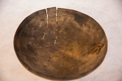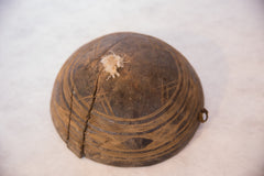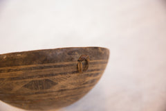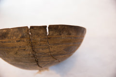 :: Vintage hand-carved primitive wooden bowl with tons of character and charm. Circa mid 20th century or possibly older. Please note this is an aged and lived with item, and as such it may have cracks, repairs, chips and/or imperfections. Kindly reference photographs for which of these may apply. Size measures: 10" x 9.5" x 5"