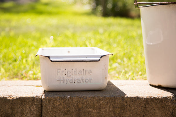 :: Vintage Fridgaire enamel tray. Cute display piece! This item is in vintage condition with slight signs of use and age. Size measures 8" x 15".