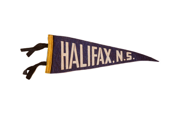 :: Vintage felt flag pennant from Halifax, Nova Scotia. Simple capitalized lettering design atop a solid blue background. Circa 1940s vintage. Condition Notes: In nice condition commensurate with age, exhibiting light creasing with no tears and perhaps minor oxidation and/or pinholes. Kindly reference photos for which of these may apply. Size Measures: 4" x 10.5"