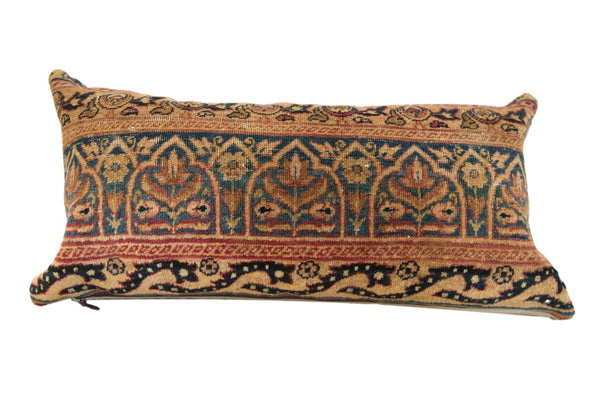 :: Reclaimed vintage rug fragment made into a lovely lumbar pillow! Vintage circa turn of the 20th century Persian Kerman hand-knotted rug remnant used to create this awesome and unique pillow! Filling is made of faux down. Condition notes: Newly made featuring vintage or antique rug fragment that itself may show signs of use and age including but not limited to foundation showing, fade, etc. Recently professionally cleaned ready for in-home use! Many years of enjoyment to come with this handmade vintage rug fragment pillow. Size measures approximately: 14" x 26" x 3".